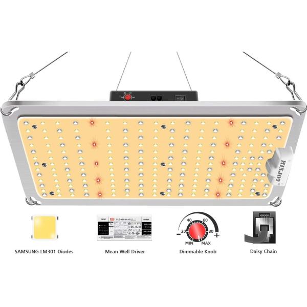 【DIMMABLE & DAISY-CHAIN FUNCTION】 LZWL-2100 Series growing lights have Dimming Knob and Power Switch, with the Daisy-Chain control box and connect cords, One grow light can control up to 20 lights’ intensity at same time. This group dimming control function no need extra control panel, very convenient to extent the coverage for big indoor growing house or large growing tent.